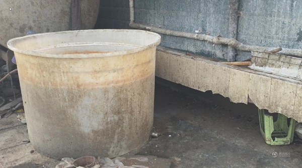 位于河南省通許縣工業(yè)園的開封勁松食品有限公司生產(chǎn)廠房內(nèi),運(yùn)送辣條的藍(lán)色塑料箱上面布滿黑色的污物和油漬(3月7 日攝 視頻截圖)。