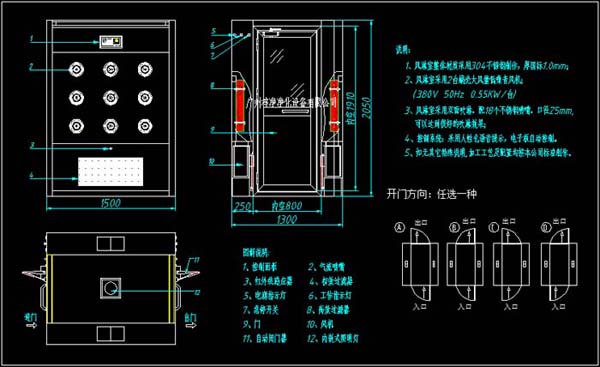 凈化車間風淋室設計制作材料說明:A、全冷軋鋼板烤漆;B、外箱體冷軋鋼板烤漆內(nèi)膽砂光不銹鋼;C、全不銹鋼;(注:根據(jù)不同使用環(huán)境不銹鋼可選201或304)。