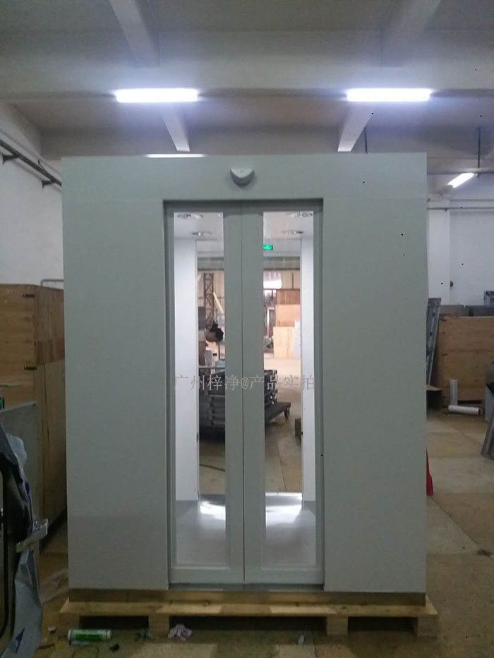 自動門風淋室感應探測器探測到有人進入時,將脈沖信號傳給主控器,主控器判斷后通知馬達運行,風淋室的兩扇外門向兩邊自動平移打開。人員進入風淋室,外門自動關閉,完成吹淋工作后,風淋室的兩扇內門自動打開,人員離開風淋室,內門自動關閉。內置自動門風淋室