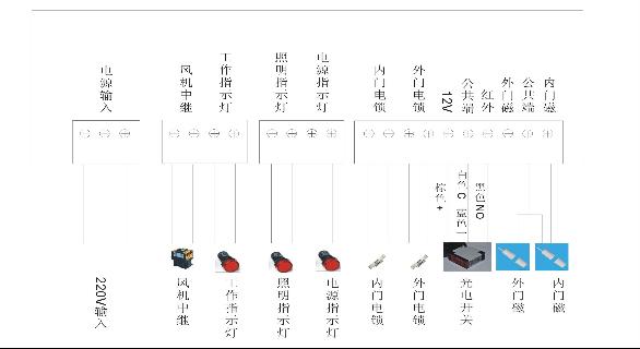 4、照明燈:當(dāng)照明燈啟動(dòng)時(shí)此燈亮,可按照明鍵關(guān)閉或啟動(dòng)。風(fēng)淋室安裝步驟詳解風(fēng)淋室主板按鍵說(shuō)明三、副板接線(xiàn)示意圖輸入、輸出端子接口說(shuō)明:
